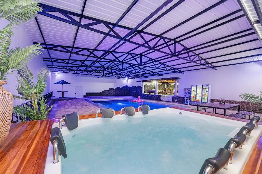 The pool area features a semi-Olympic size pool and a 10-person jacuzzi. You may choose to heat up the pool for an extra cost. There is also a lounge area just outside of the pool where guests chill and nurse their hangovers.